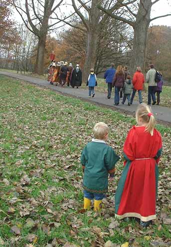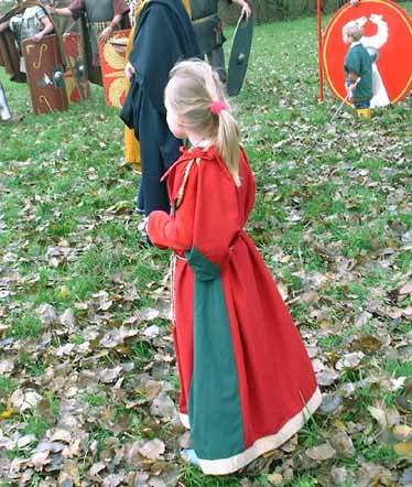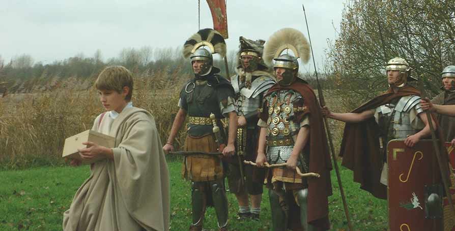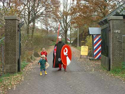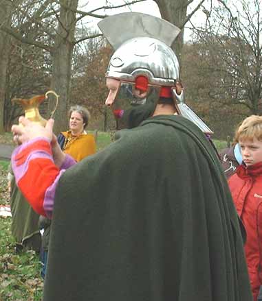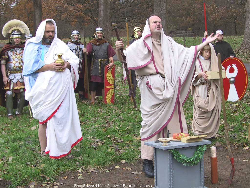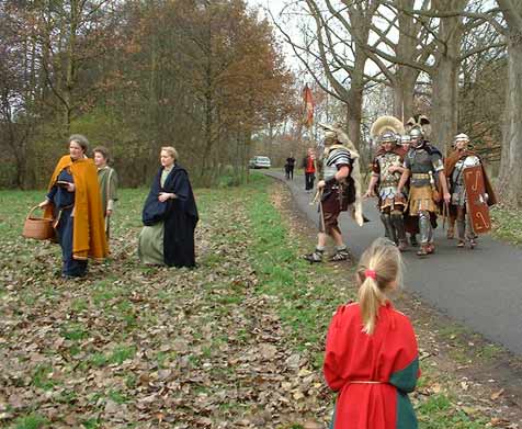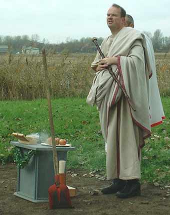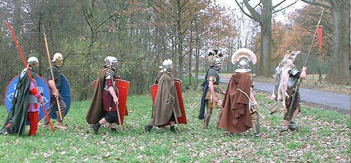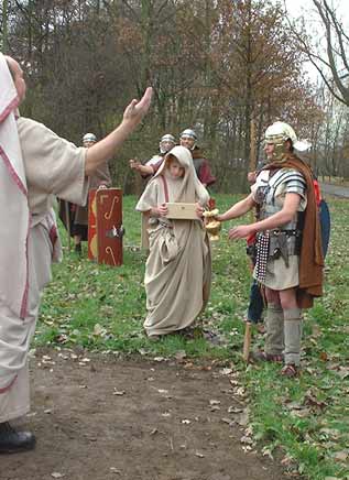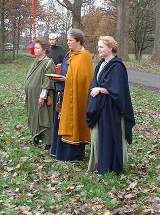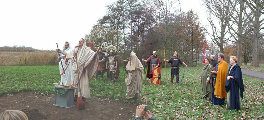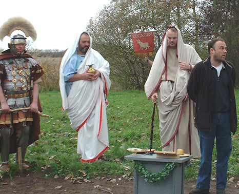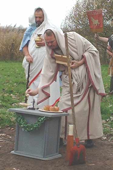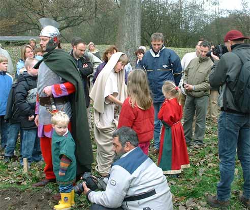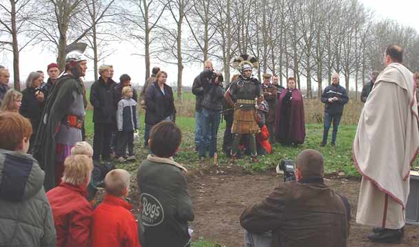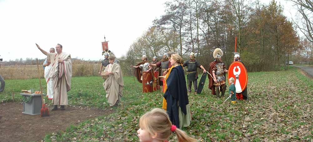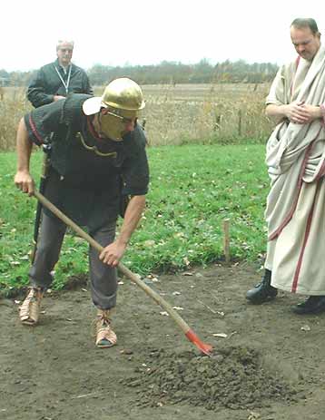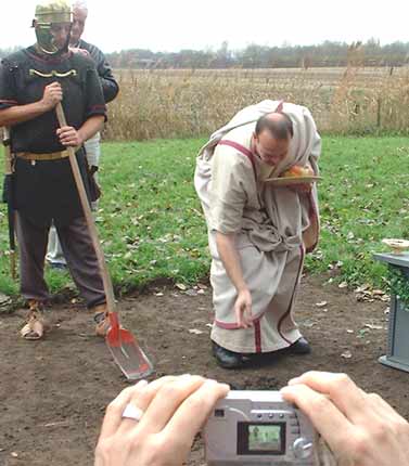 Saturday 15th November, we did the first show at Fort Vechten, as the groundwork was laid for a replica of a Roman watchtower as could be found all along the Limes. This tower will be built between the 19th-century fortress and the field which still covers the remains of the castellum Fectio, to be revealed by April or May 2004. The show was held at the site where the tower will be built. Present were, besides the members of Fectio, members of Corbvlo, Leg. X Gemina and Leg. II Augusta. The weather was grey but good, at least there was not much wind, and no rain! A bit cold though, which was no so bad for yrs truly (being a Late Roman has some advantages), but several of the earlier bare-armed/legged Romans were not so lucky.. A good number of spectators had gathered on the Marsdijk (The dyke of Mars - aptly named), the road which skirts the south side of the fort. Some journalists as well, which of course was good news for the organisers. Our priest made a good show of it. For the site of the watch tower to be blessed properly, there was a good number of gods to be consulted, the old Romans did not mind a god or two extra. Starting with Janus, the eldest of the pantheon, of course. Very important as well were the omens. Would they be favourable? Any birds in the sky (preferably eagles), flying in the right direction? No birds, no omens, good news. With that behind us, the offerings were ready to be buried. When the building starts, it will all be sealed under a great slab of concrete on which the tower will be built. Maybe our descendants will one time dig them up and wonder about us. With the earth sealed again, time for a