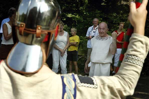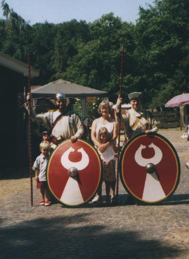 We were invited by Gelders Erfgoed to do a little show on a sunday at a small museum, Museum Freriks near Winterswijk. With temperatures as high as 31 degrees, it was very nice to have all the trees around, so we spent a very nice afternoon with a very friendly crowd. There were two (semi)professional storytellers around, and our little 'show 'n tell' fitted very well into their act. Henk Waaijenberg told the crowd about his days in the Roman army and his 'retirement', and we completed the story about the Late Roman army. All in all, a good day. Too bad for the pictures, my camera decided to refuse service.. Just two remain, one from a journalist and the other from my dad, showing me and Andreas, my kids and my mom. |