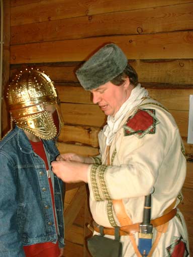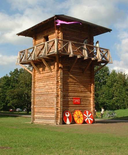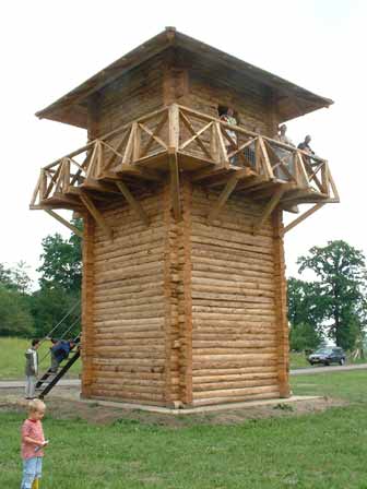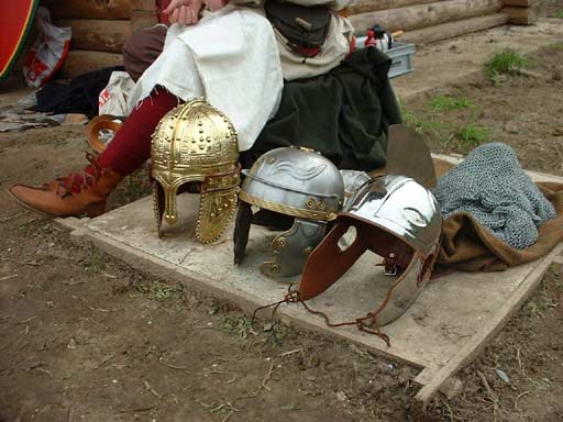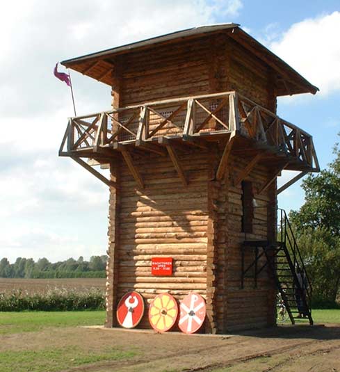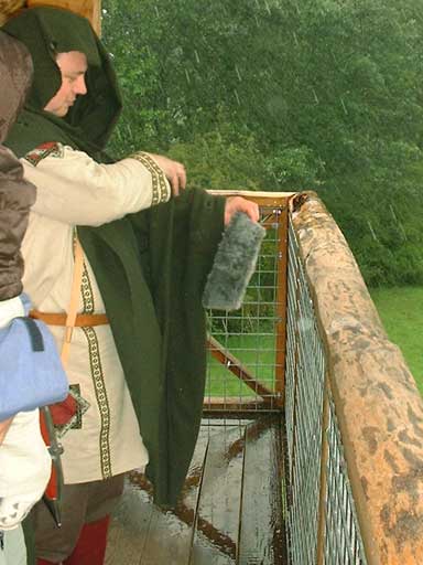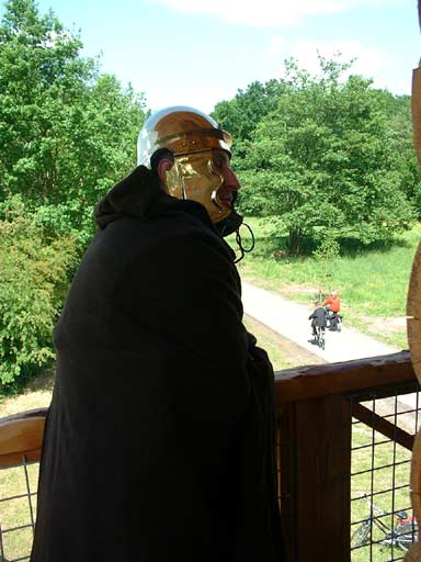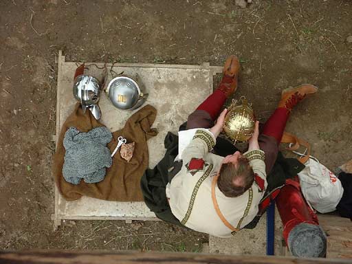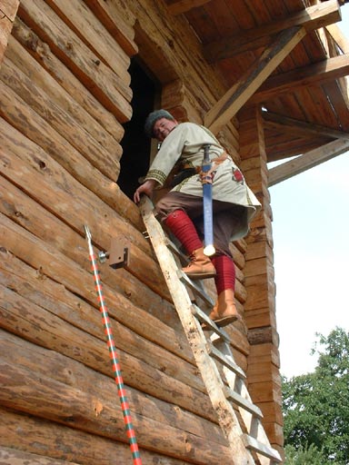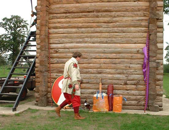 August 29th, summer After the summer break the season at the tower has started again. Andreas/Chariovalda, recently issued with his new Deurne Late Roman helmet, did the honours for Fectio. One problem though, due to some untimely gardening around the tower, the ground was too soft to attach the sturdy steel stairs. So, an authentic wooden ladder was the only option to get into the tower. Very period-wise, but not so good for the young and feeble!