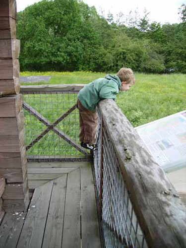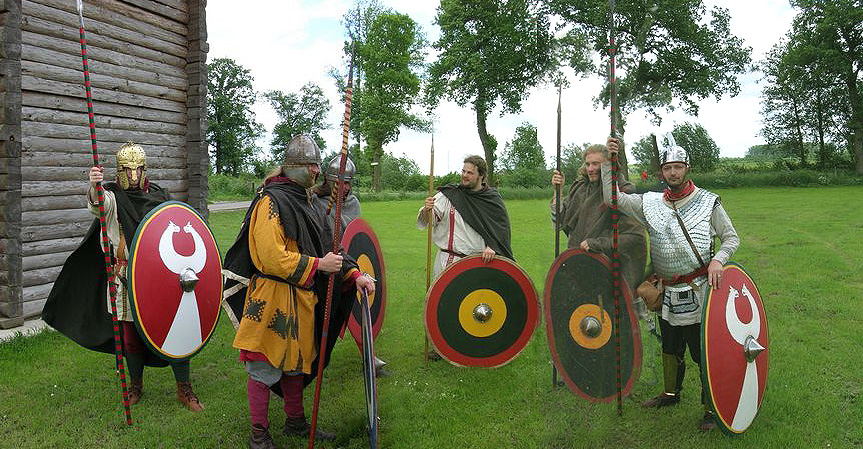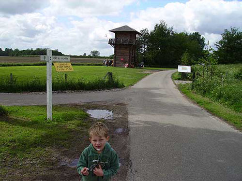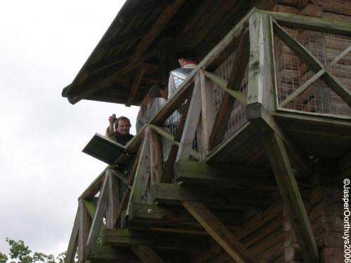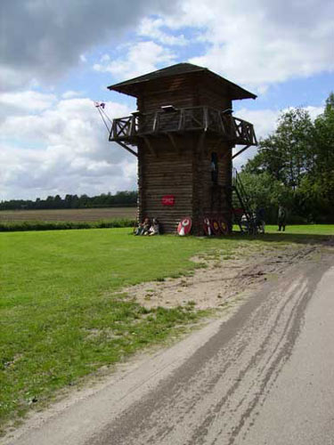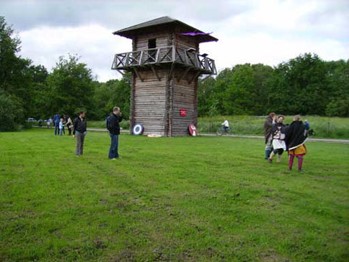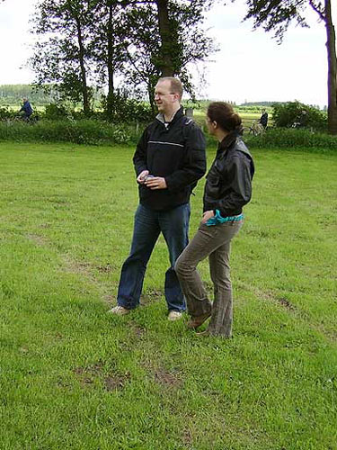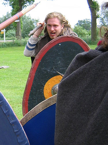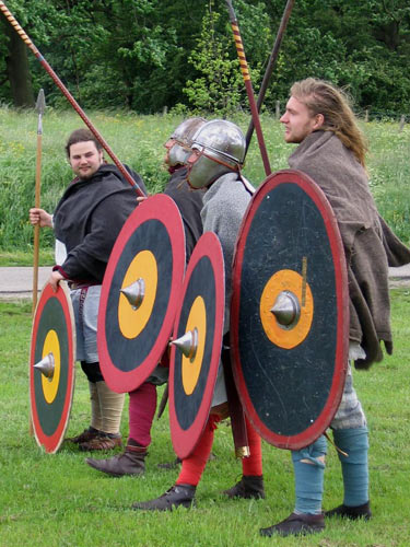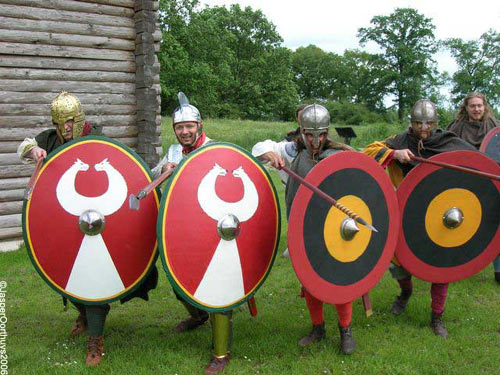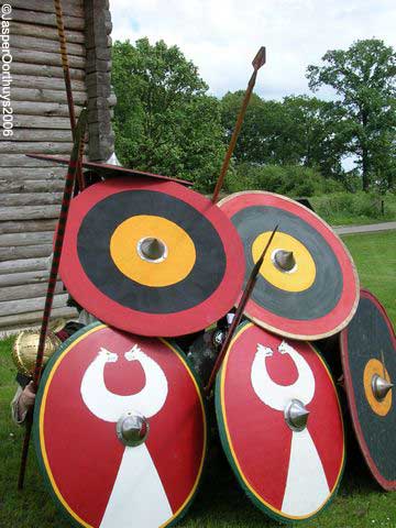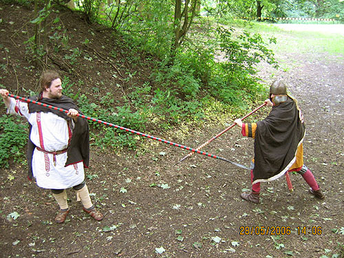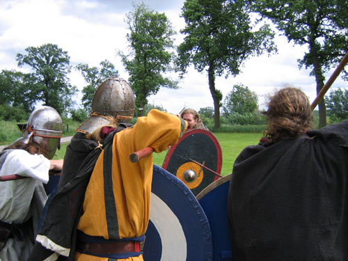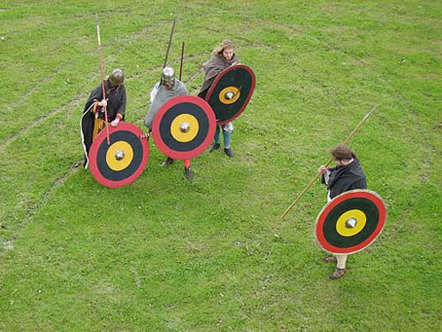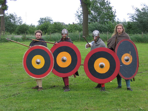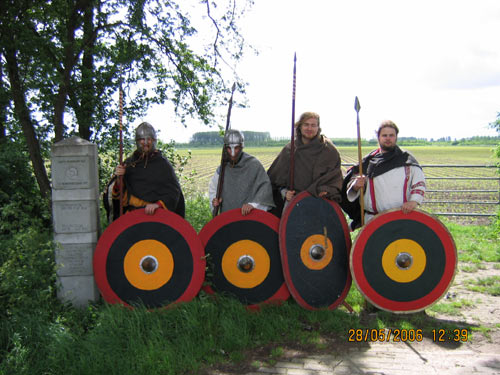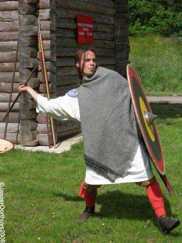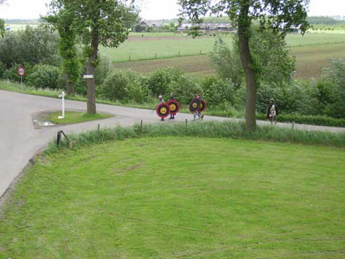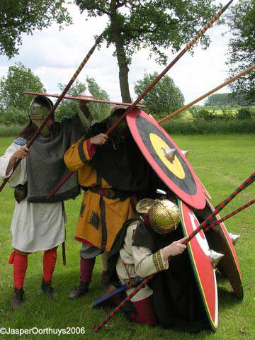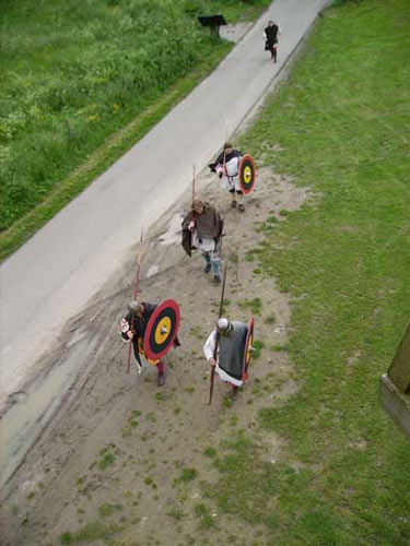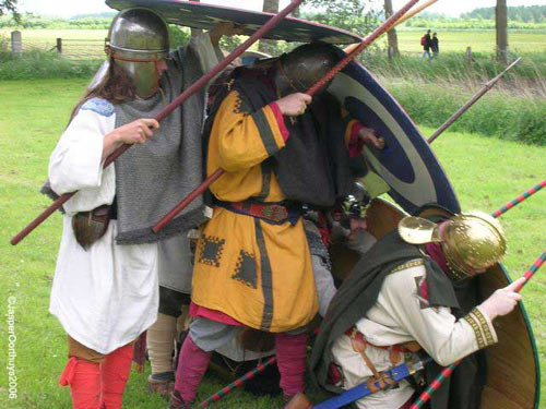 But of course we also had new things to show, such as our new greaves, ocrea. Whilst discussing all the material, tactics, groups and plans, we had a lot of fun. Of course we all brought food and drink, so instead of a patrol visiting a tower, our Roman outfit looked more like a cosy picnic! Later on, Andreas showed our guest round the big 19th-c. Fort Vechten, while me and Jeroen guarded the tower at leisure. In the meantime, not very many people stopped by. Unfortunately it had been raining for almost a week, and though the weather forecast had been favourable, just a few people had gone for a trip. Only a big bunch of Americans had taken their bikes on a guided tour of the Dutch countryside, but most Dutch had stayed at home. But besides a strong wind from the north, the weather was quite good, with large sunny spells even. We felt truly lucky. And in the afternoon, bicycle traffic picked up a bit, and we had several interested visitors. Lucky for us, not all of them. A friend of ours had come all the way from Nijmegen to see us and out guests, bringing his 'wannabe-cloggie American girlfriend with him. And since these two internet wizards are the driving force behind the Roman Army website (if you want to read what we talk about, click here), the discussion turned technical after that. And so, the guard-duty turned into a kind of mini-event Of course we did some drill practise. As Late Romans, we dont meet with other Late Romans very often, so the chance to do something together was taken up with glee. We did some formations such as a shield wall and a fulcum, the Late Roman version of the testudo. This formation was in use against cavalry, with one rank crouching behind the shield, the second rank covering them, and the third covering their heads. All hold their long spears out at a 45-degree angle. According to ancient sources, such a formation of infantry was nearly unbreakable.