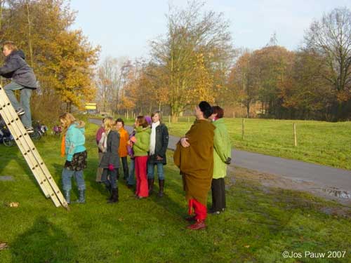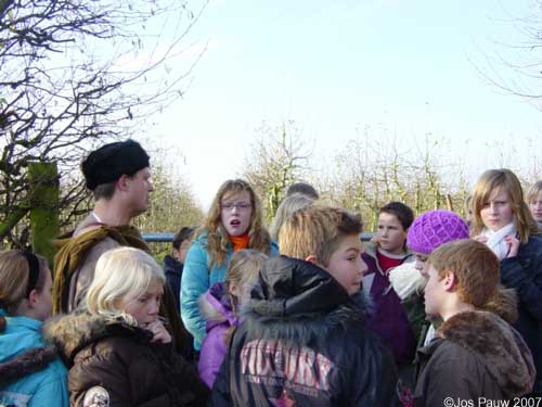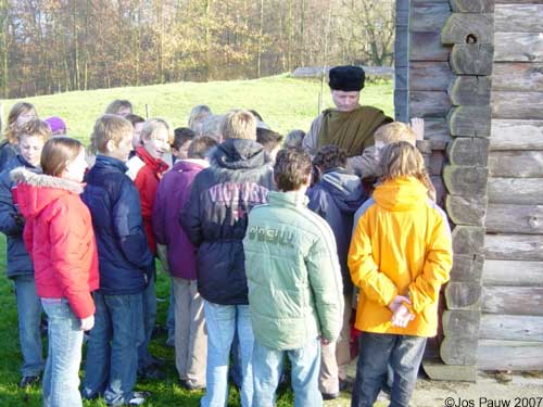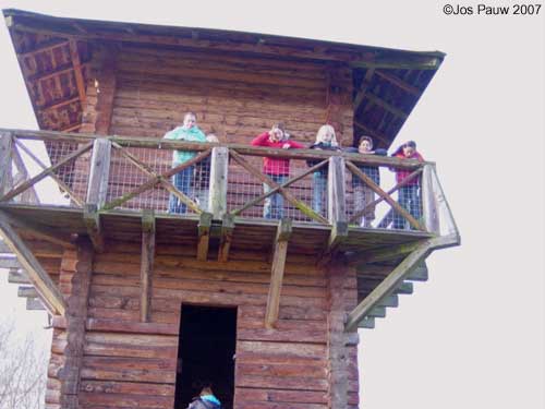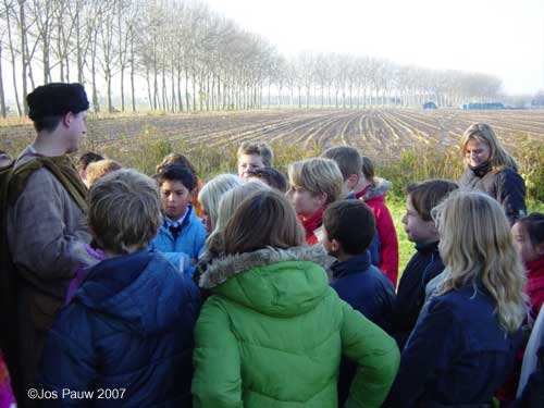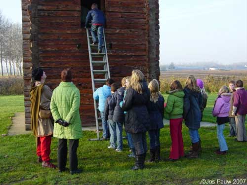 Getting 26 kids (between 10 and 11) plus 3 teachers up the tower proved easier than expected. Not the normal big steel stairs from the fort, but a smaller one borrowed from my father-in-law. The kids were up the tower in no time, and after they had ran around enough I could start a talk about the surroundings of the fort. Later, after everyone had managed to descend back to earth, we continued at the entrance of the orchard, next to the real Roman fort, Castellum Fectio. I think the kids had a good time when we finished an hour later, and so did I. |