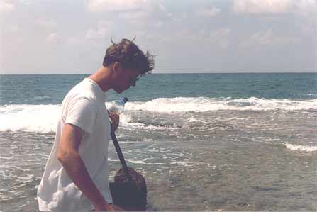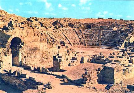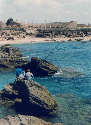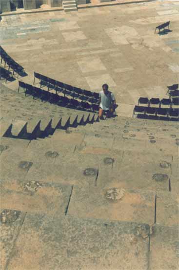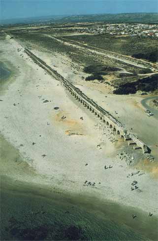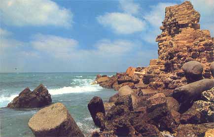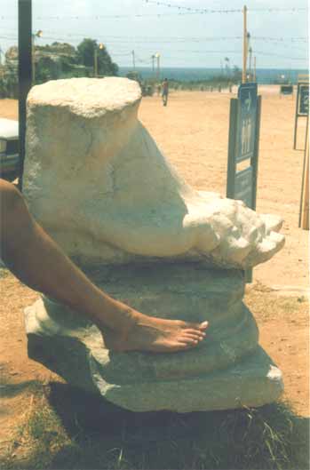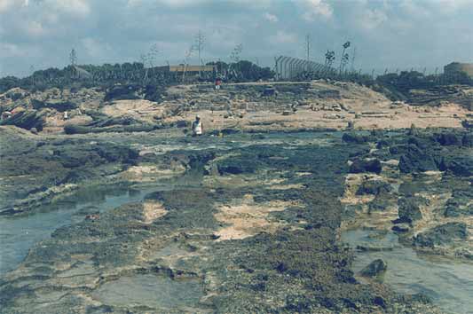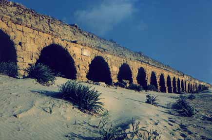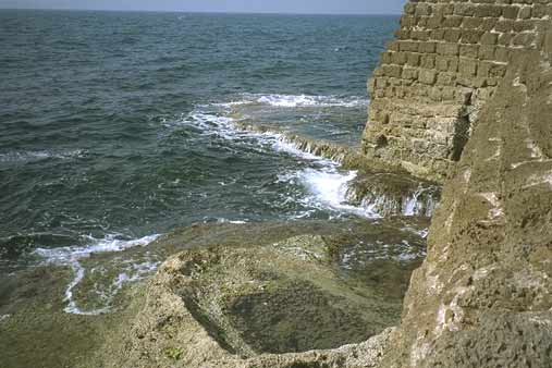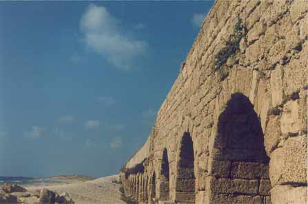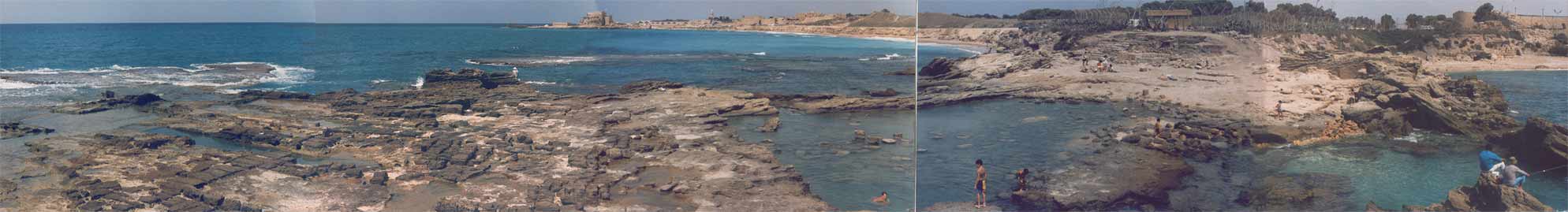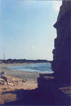 The Visit Menno and I went by bus from Netanya, and it took us a bit of asking around to get the right one. Apparently, Caesarea was not as popular with the tourists as we had expected. Which was fine with us, because it meant we pretty much had the place to ourselves once we got there. Well, 'to ourselves' may be an understatement. It was rather desolate. Sure, there were some people around - apparently there was an archaeological dig going on, as well as reconstruction work on the ruins, but that was about it. Driving up there, through the shrub and orchards that line the coast, there was not a soul in sight. Maybe it had something to do with the time of day, or the temperature? It was hot. Very hot. I should insert a small note here before moving on with my description of our visit. As I'm writing this, I realise the site has changed a lot since 1990. Vast areas of the ruins have been 're-done', such as the area between the amphitheatre and the Crusader town. There is a new access road as well, so some details of my description will surely sound alien to modern readers. My apologies. Time does not halt for memories. Which is a bit what I feel, looking back. Of course, when we arrived at the town the emptiness was surprising, but when we started exploring the place, that feeling changed. It was clear, we soon found out, that Caesarea was in full swing! Meaning, there was building activity all over the place. We bought a few older postcards and soon noticed we'd missed some romantic ruins, which now radiply were replaced by smooth, slick reconstructions. The amphitheatre was already completely 're-done', and had already seen some big productions.. OK, you say, nothing new, the did that at Xanten in Germany, as well as Augst in Switzerland, and all over the Meditterranean. It serves to use the ruins and catch the big money as well as the public, and, if possible, prepare the heritage. However, with its neat, clear rows of seats, it somehow looked out of place, almost modern. So far, so good. We moved on towards the sea. What remained of Herod's Palace, and of Pilate's and every other Roman procurator's palace as well, was a waves-swept terrace, barely above sea-level, with a grand view of the city. Of course, we had to climb a fence, for some impolite person sneered at us that "the nice rocks were to be found elsewhere". We ignored him and proved him wrong, as the pictures show. We then ventured along back through the town, because the beach was cordoned off, too bad. A hefty trip in the increasing heat, but we arrived at the inner city, now recognisable as the Crusader Town. There was a nice shade and we hid for some time in the old vaults to cool down a bit, before nearly getting lost in the moat! Sliding down, we did not immediately found a way out again (stupid) and walking the whole moat back was not particularly appealing! Not appealing either were the ugly-looking touristic stands which now dominated the Crusader town, and after a quick check of the remains of the southern breakwater, we left for the aquaduct. Now, that was a hefty walk! Seven kilometres through the heat, across a sandy and dusty track. But it was worth it. The aquaduct, still unspoilt by modern work, looked really old, the way it should. Half-buried arches which once carried tons of water, now broken by the waves. Impressing. Very hot, too, we did not stay long. Too bad the view south was spoilt by the big coal-powered plant at Hadera, with its big pipes..