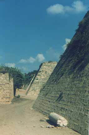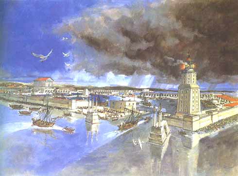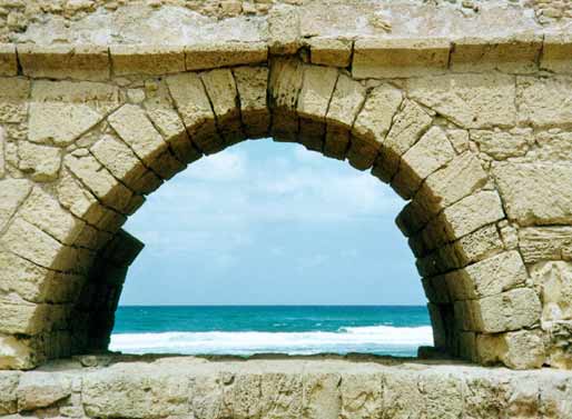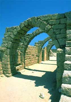 The great harbour already began silting up during Roman times, yet activities continued until the inner harbour completely silted up during the 6th century. As a result of changes in the coastline of Caesarea, Sebastos - the city's main feature - was lost. The sinking of the breakwater began the ongoing silting process of the inner harbor. Caesarea's inhabitants were forced to act in order to ensure the continued usefulness of the harbor. In accordance, during the 2nd and 3rd centuries, the Romans built a new pier attached to the center of the Herodian pier. However, the silting process continued and by Byzantine times this addition was of no further use. Byzantine Caesarea During this period, Caesarea became an important Christian centre. The Church Father Origen founded a Christian academy in the city, which included a library of 30,000 manuscripts. The main church was the Martyrion of the Holy Procopius, built in the 6th century upon the remains of the Roman temple on the podium. The octagonal, 39 m.-wide church stood within a square precinct measuring 50 x 50 m., surrounded by rooms along its walls. The floor was paved with marble slabs in a variety of patterns. Of the rows of columns in the building, several Corinthian capitals decorated with crosses were found. Byzantine Caesarea was surrounded by a 2.5 km. long wall, which protected the residential quarters built outside the Roman city. It had a 3 m.-wide city gate in its southern section. Side by side with the Christian population and its numerous churches, there were Jewish and Samaritan communities that built elaborate synagogues. During this period, the Roman inner harbor was blocked and buildings were constructed on what had become dry land. A row of vaults serving as shops was built against the podium wall facing the port. A very large and elaborate building, which included numerous courtyards and rooms spread over the area of an entire insula (block of buildings) and surrounded by the main streets of the city, was dubbed the government building. Its entrance was from the cardo (north-south main street), its western side supported by a row of vaults, which had once served as port warehouses. One such vault facing the decumanus (east-west main street) was plastered and decorated with red and black wall paintings, including depictions of Jesus and the twelve apostles. Remains of a 5th century synagogue were found on the seashore north of the harbor. The rectangular building faces south towards Jerusalem. Architectural details were found in its ruins, including capitals with carved menorot (candelabra), a column inscribed shalom and parts of a Hebrew inscription listing the twenty-four priestly courses in the Temple in Jerusalem. Inside the amphitheater, which was no longer in use, a two-level palace was built with a staircase connecting the two levels. The upper level included two courtyards and rooms paved in colored tiles or mosaics and served as the residence. The lower level had a courtyard with an apse on one side, paved in colored tiles. Along this courtyard stood two rows of columns with a marble chancel screen between them and in the northern wall was a fountain with a rectangular basin below it. This lower level served as an open garden. Arab Caesarea The end of Caesarea as a main city resulted from the destrcutive wars between the Byzantine and Sassanid empires during the 7th century. The Sassanid Persians conquered the city and ruled it for 14 years. Shortly after its reconquest by the Byzantines, Arab forces lay siege for 7 years, finally conquering the town in 640 AD. Thereafter, the town declined in importance, although it remained a flourishing harbour. Urban areas were abandoned and replaced by agricultural terraces. This Arab town was surrounded in the 10th century by a 3 m.-thick wall. Caesarea of the Crusaders With the onset of the Crusades, Caesarea fell to Christian forces again in 1101, in the form of the Frankish army under King Baldwin I. Caesarea became the seat of an archbishop and not only Franks but also eastern Christians and Muslims settled there. The Genoese found a green-colored glass vessel in the city and declared it to be the Holy Grail, the goblet used by Jesus at the Last Supper. It was taken to Genoa and placed in the Church of San Lorenzo. By in 1187 Saladin reconquered it again, but it was retaken in 1191 by Richard the Lion Heart, King of England, who exiled the Muslim inhabitants. Over the following years, Caesarea changed hands a number of times, returning to Christian domination in 1228. Louis IX built the currently visible walls in 1251, and a magnificent 4 m.-thick wall, some 1.6 km. long, surrounded the city, which covered an area of about 40 acres. It was also protected by a glacis, towers and a 10 m.-deep and 15 m.-wide moat. The cathedral of the Crusader city was built on the podium raised by King Herod to serve as his citys acropolis. The 12th century cathedral, the eastern part of which was added in the middle of the 13th century, was a modest structure measuring 55 x 2 m. The hall was divided into a central nave and two aisles that ended in the east in three apses; the floor was paved in mosaics. The vaulting was supported by rectangular piers and pilasters.