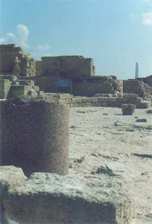 The palace was built on a rock promontory jutting out into the sea, in the southern part of the Roman city. The excavations revealed a large architectural complex, measuring 110 x 60 m., with a decorative pool, surrounded by porticoes. This elegant structure in its unique location was identified as Herods palace. (Antiquitites, XV, 332) The palace was in use throughout the Roman period, as attested to by two columns with Greek and Latin dedicatory inscriptions naming governors of the province of Judaea.