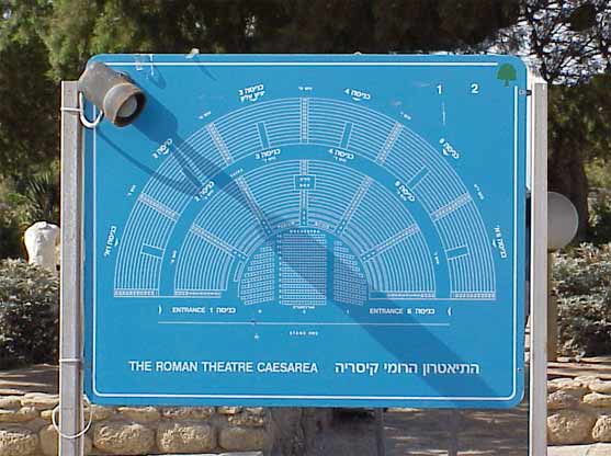 The theater is located in the very south of the city. It was commissioned by King Herod and is the earliest of the Roman entertainment facilities built in his kingdom. The theater faces the sea and has thousands of seats resting on a semi-circular structure of vaults. The semi-circular floor of the orchestra, first paved in painted plaster, was later paved with marble. In the excavated theater a stone was found, bearing parts of an inscription mentioning Pontius Pilate, Procurator of Judea, and the Tiberium (the edifice in honor of the Emperor Tiberius) which he built. The amphitheater, on the citys southern shore, was north-south oriented and measured 64 x 31 m. Its eastern and rounded southern side are well preserved; the western side was largely destroyed by the sea. A 1.05 m-high wall surrounded an arena, covered with crushed, beaten chalk. When first built in the Herodian period, it seated about 8,000 spectators; in the first century AD seating areas were added, increasing its capacity to 15,000. The dimensions, shape and installations indicate that this amphitheater was used for racing horses and chariots and was, in fact, a hippodrome. During the second century, the amphitheater was rebuilt and adapted for use as a more standard type of amphitheater.