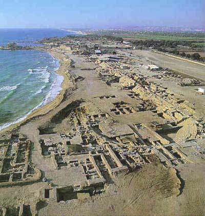 Caesarea Maritima Caesarea is located on the Mediterranean coast, about midway between Haifa and Tel Aviv. Archeological excavations during the 1950s and 1960s uncovered remains from many periods, in particular, a complex of fortifications of the Crusader city and the Roman theater. Founded as a colony of Phoenician Sidon in the 3rd century BC named Straton Tower, it remained a less important settlement. Until the arrival of Herod the Great that is, who built a great harbour from 22 to 10 BC, forever changing the destiny of the town. Herod named it Caesarea in honour of Augustus Caesar. The historian Josephus Flavius, who was born around 7 or 8 CE, published a history of the Jewish people in 93-94 AD. This work contains a detailed description of the city of Caesarea and its harbour, Sebastos, and its development by Herod, as he built palaces, a temple, an amphitheatre, public buildings, a market place and a deep sea harbour: Flavius