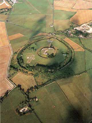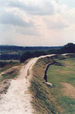 We may take this 'Saxon' takeover with a pinch of salt, as the name of the Saxon king (Cynric) is a British one (Cunorix), as is the name of his father Cerdic (Ceredig) and his son Ceawlin (Collen). Recent thoughts on this subject see the West Saxons as having been of very mixed origin, only to be 'germanised' later when the Anglo-Saxon culture had taken over England. 'Celtic' finds in north Wiltshire and the growing certainty that the West Saxons (or Gewissae as they were called earlier) started out in the Thames Valley, may strengthen this view. In all probability, the kingdom of Wessex conquered Salisbury only later, after the (equally mixed) kingdom of Mercia started to push south from the Midlands. The 'Saxon' origins of Wessex were acquired after it took over south Hampshire and the island of Wight from the Jutes. Anyway, the new owners thereafter made use of the fortifications and a sizeable town developed. The Saxon settlement must have been fairly formidable as it was given a wide berth by the invading Vikings of King Sweyn in 1003. Other settlements in the area were not so lucky. The nearby town of Wilton, only four or five miles away, suffered badly at the hands of the Vikings. The fortress eventually did change hands following the Norman invasion of 1066 and it was then that the most striking remains seen today were first built. As you can see from the aerial photograph the hillfort was remodelled into a Norman Motte and Bailey design. The first wooden fort was constructed in 1069 when the central Motte was constructed. In 1070 William the Conqueror paid off his entire army in the outer bailey of the new castle and in 1089 the major landholders of William's kingdom gathered at Old Sarum to swear their oath of loyalty. The visit The hillfort of Old Sarum lies to the immediate north of the modern town of Salisbury. A 15 minutes bike-ride will get you there, but there is a bus connection as well, and of course you can park the car close by the monument. There is an admission fee to enter the Norman inner fortress, but when you are not interested in that, or the very nice views from the top of the ruins, you can wander around the outer area for free. This area is what's left of the original Iron Age fortress, and one can but wonder how many people may have lived here at one time, or Vortigern's time for that matter. During late summer, there's usually a re-enactment event which can help imagining what those times were like. That