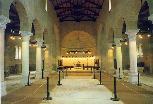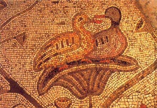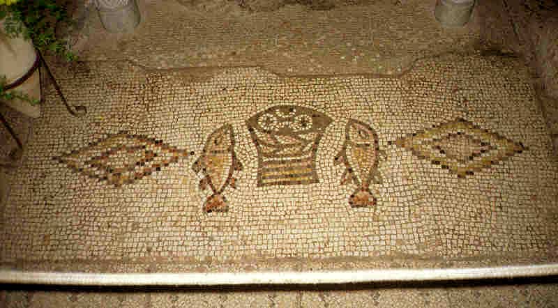 Origins Two miles west of Capernaum lies what Josephus referred to as the "well of Capernaum." Also known as Heptapegon, el-Oreme, En Sheva, 'En Sheva, et-Tabgha. The name derives from the Greek Heptapegon(from the "seven springs" once known there), the name was later corrupted to Tabgha. This is the traditional location for several episodes in Jesus' ministry. The seven springs that emerged at Tabgha (today only six have been discovered) produced warm water, which in turn attracted the fish because of algae growth. This meant that the area may have been popular with fishermen for thousands of years. Recently a harbour was discovered, the curved western breakwater being 60 meters and another 40 metres long. Tabgha is the traditional location for the calling of the disciples. It is believed amongst Christians that Jesus walked along the shore at this spot and called out to Simon and Andrew who were fishing. Jesus later called two other brothers (James and John) who were preparing their nets. All men followed his calling. Tabgha is also associated with the teaching of the Beatitudes. Later at this spot Jesus is said to have restored Peter to his old position amongst the disciples, after the latter had denied him three times at Gethsemane. Catholic Christians believe this was the occasion when Peter was made the single leader of the Church. The most famous at Christian occasion at Tabgha, however, is the miracle of the Multiplication of the Loaves and the Fishes, also known as the feeding of the 5000. However, this belief is based on a mistaken identification of the place by early pilgrims, because the Scripture says that it took place in a remote place by Bethsaida. The Site Nevertheless, during Late Roman times the first buildings were erected to commemorate these events. The earliest building at Tabghawas a small chapel (18 x 9.6 m) from the 4th century CE; only a part of its foundations was uncovered. This was probably the shrine described by the pilgrim Egeria in 383: In the same place (not far from Capernaum) facing the Sea of Galilee is a well watered land in which lush grasses grow, with numerous trees and palms. Nearby are seven springs which provide abundant water. In this fruitful garden Jesus fed five thousand people with five loaves of bread and two fish. The stone upon which the Master placed the bread became an altar. The many pilgrims to the site broke off pieces of it as a cure for their ailments. She further listed some steps on the shoreline where Jesus once stood; an adjoining grassy field where Jesus fed the people with the five loaves and the two fishes; and a nearby cave on the "mountainside" where Jesus preached the Beatitudes. She only mentions one religious building (a church containing the stone on which Jesus placed the bread when dividing it for the multitude), but modern archaeological research found that small chapels had been built at all three sites during the second half of the 4th century. In the 5th century, the church was rebuilt and enlarged into a large monastery and a church decorated with exquisite mosaic floors was built on the site. The complex covered an area of 56 x 33 m. and included courtyards and many rooms used as workshops for a variety of crafts as well as for lodging for the monks and the many pilgrims who came to visit. However, this building and the two nearby chapels were destroyed sometime in the 7th century, probably at the time of the Sassanid Persian invasion or possibly during the Arab invasion later. Bishop Arculf, who visited the place in 670, found only a grassy and level plain with no traces of buildings, except for a few columns around a spring. The small chapel on the lakeshore was rebuilt sometime later, but the Crusaders found it in ruins when they arrived in 1099. They rebuilt it, but this chapel was also destroyed in 1187, after the defeat of the Crusaders at Hattin. Rebuilt in about 1260, the chapel was razed to the ground only three years later by the Mamluks in 1263. The Church In the 1980s, after excavation, the church was restored to its Byzantine form, incorporating portions of the original mosaics. The basilical church is divided by two rows of columns into a central hall and two aisles. In the eastern wall is a semi-circular apse and on either side of it, rooms for the officiating clergy. A raised platform in front of the apse is surrounded by a chancel screen and at its centre an untrimmed stone was preserved under the altar. This is the traditional site of the miracle of the Loaves and the Fishes. A mosaic depicting a basket of bread flanked by two fish was found behind the untrimmed stone. It was added in the 6th century, suggesting the stones significance; today it is displayed in front of the altar. The artist was apparently unacquainted with the fish in the lake as none have two dorsal fins. The church is famous for its mosaics, unique among Byzantine churches in the Holy Land. Most of the floor of the church is decorated in ordinary geometric patterns. The unique principal mosaics decorate both sides of the transept. Particularly well preserved is the one on the left of the platform, a square carpet (6.5 x 5.5 m.) bordered with a band of lotus flowers. The carpets are decorated with multi-coloured representations of the local flora and fauna, interspersed with several buildings. The flowers and animals, mainly birds, are so naturalistically depicted that it is possible to identify lotus, oleander and lily; also duck, snipe, heron, goose, dove, swan, cormorant, flamingo and stork. A tower marked with bands bearing Greek letters, probably for measuring the water level of the Sea of Galilee (known as a "nilometer"), is also depicted. The present Chapel of the Primacy of Peter was built by the Franciscan Custody of the Holy Land in 1933. The nearby Benedictine monastery and Church of the Multiplication of the Loaves and the Fishes was consecrated in 1982.